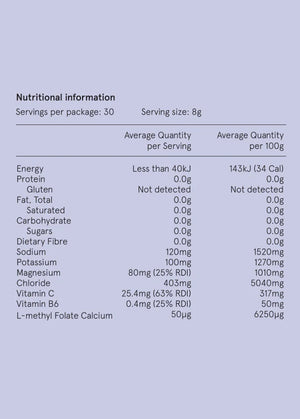 Natural Sweetener(Erythritol – derived from vegetables), Mineral Salts (Magnesium Glycinate, Sodium Chloride, Mono Potassium Phosphate, Sodium Citrate), Natural Flavours (derived from vegetables and fruits), Natural Colours (derived from vegetables and fruits), Vitamins (Ascorbic Acid, L-Methyl Folate Calcium, Vitamin B6 - Pyridoxine Hydrochloride).