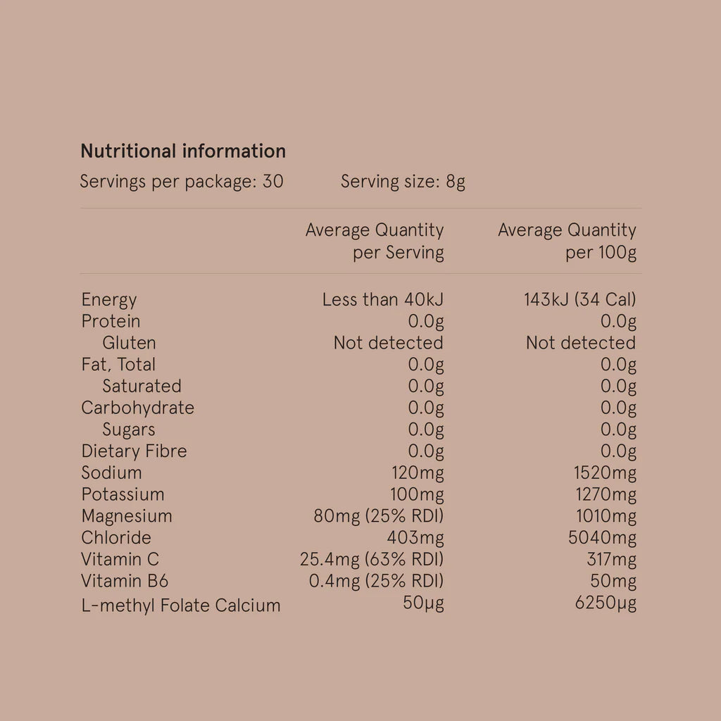 Natural Sweetener(Erythritol – derived from vegetables), Mineral Salts (Magnesium Glycinate, Sodium Chloride, Mono Potassium Phosphate, Sodium Citrate), Natural Flavours (derived from vegetables and fruits), Natural Colours (derived from vegetables and fruits), Vitamins (Ascorbic Acid, L-Methyl Folate Calcium, Vitamin B6 - Pyridoxine Hydrochloride).