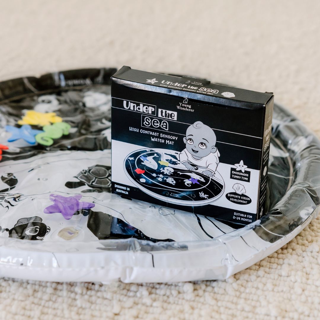 This high-contrast water mat is a wonderful way to encourage tummy time with your little one. Newborn eyes see the world as a blurry place—black and white patterns are scientifically proven to stimulate early vision development.